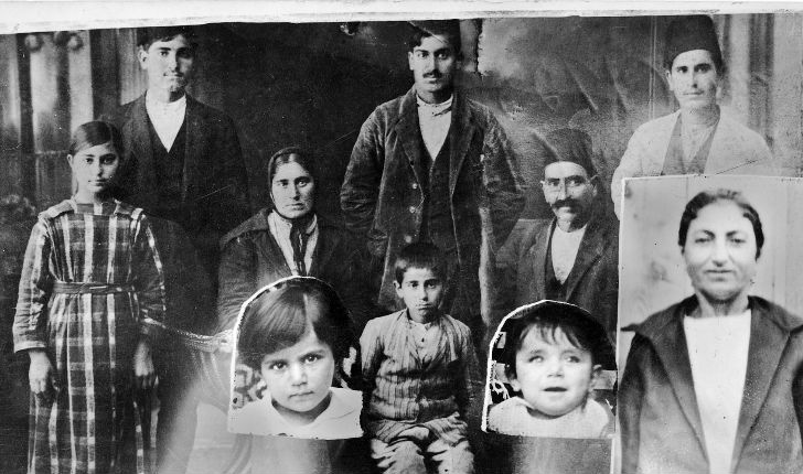 | Familia de Hagop Karamanoukián. Fotomontaje realizado en Montevideo en 1928 incluyendo el último retrato de la familia Karamanoukián, producido en 1923 antes de su viaje a Uruguay, y los retratos posteriores de sus dos primeros hijos y su primera esposa, Ovsanná Marashlián, fallecida en Medio Oriente. (Autor: s.d. Fecha: año 1923-1928. Col. Daniel Karamanoukián). |